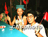 ![]() 北京時間十三日晚二十二時許,福州一對情侶在酒吧獲悉北京成功取得2008年奧運會申辦權后欣喜若狂。中新社圖 劉可耕 攝