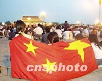 圖:等待天安門(mén)廣場(chǎng)的升旗儀式 2001年07月14日 11:27 ![]() 七月十三日晚的北京沉浸在興奮和歡樂(lè)的海洋中,天安門(mén)廣場(chǎng)更是紅旗招展,歡呼聲不斷。十四日清晨,歡慶申奧成功的人群安靜下來(lái),靜靜地等待著中華人民共和國(guó)國(guó)旗在天安門(mén)廣場(chǎng)升起。中新社圖 武仲林 攝