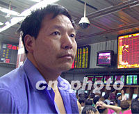 中國深滬股市周一的大幅下跌使北京證券市場的股民頗為吃驚。當(dāng)日深證成份指數(shù)以跌223.995點(diǎn)(-5.16%)報收,上證指數(shù)以跌108.91點(diǎn)(-5.27%)報收。七月以來,中國股民對國有股減持價格過高表示了一定的擔(dān)憂。中新社記者 鄒憲 攝