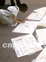 圖:紐約華人以各種形式譴責恐怖主義 2001年09月19日 15:01 ![]() 紐約華埠孔子廣場平整的紅色地面上,近日貼著許多白色卡紙,上面用中英文寫著譴責恐怖活動;悼念“九一一”死難者;祈求世界和平;以及支持重建世貿中心大廈的字句和詩篇。圖為一位華裔女青年跪在地上寫下自己的心愿。中新社圖 龔文謨 攝 |