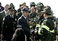 圖文:恐怖襲擊事件后布什第二次訪問紐約 2001年10月04日 09:51 ![]() 美國總統布什三日清晨來到紐約。他一下飛機,就頭戴印有“紐約市消防局”字樣的棒球帽,和參加救援與清理工作的人們握手。“九一一”恐怖襲擊案三周來,布什現已兩次訪問紐約。
