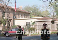 圖文:紐約空難后美國駐華大使館擴大警戒范圍 2001年11月13日 15:37 ![]() 北京警方13日在美國駐中國大使館前增加警力并擴大了警戒范圍,幾條通往使館門前的道路都設置了路障,禁止行人和車輛通行。美國美洲航空公司一架空中客車十二日在紐約墜毀,是否與恐怖主義襲擊有關仍有待進一步調查。中新社圖 武仲林 攝 ![]() 美國墜機事件后,中國軍方十三日對位于北京建國門外的美國使館區加強安保工作!熬乓灰弧焙笠恢睂嵭薪鋰赖拿朗桂^區內秩序安定。中新社圖 劉殊瑾 攝
