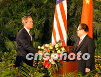 中新社北京二月二十一日十三時十五分電 本社記者譚宏偉現場報道:今天下午,中國國家主席江澤民和美國總統布什在結束大約一小時四十分鐘的會談后來到人民大會堂中央大廳共同會見記者。 江澤民說,在今天的會談中,我與布什總統回顧了中美關系三十年的歷程,深入討論了雙邊關系和當前國際形勢,達成了許多重要共識,取得了多方面的積極成果。 兩國元首將在預計三十分鐘的時間里,向早已等候在這里的三百多名中外記者介紹此次峰會的主要內容并回答有關提問。記者會現正在進行當中。