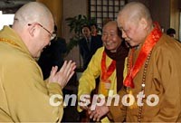 圖:兩岸佛教人士匯聚西安 2002年02月22日 09:30 ![]() 由臺灣佛教人士組成的法門寺佛指舍利赴臺灣地區瞻禮(供奉)恭迎團,日前乘專機抵達西安。圖為兩岸佛教人士相互施禮。中新社記者 錢興強 攝