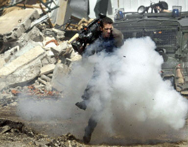 圖文:以軍在阿拉法特總部前向記者發射震撼彈 2002年04月05日 20:26 中新網北京4月5日消息:以色列部隊今天在拉姆安拉向巴勒斯坦領導人阿拉法特總部前的記者發射震撼彈。 事發時,大批外國記者趕到現場報道美國中東和平特使津尼定于當天與阿拉法特的會晤。 圖為以軍發射震撼彈時,路透社的巴勒斯坦籍攝像記者伊斯梅爾·卡代爾試圖躲避。(法新圖) 相關報道:以軍向國外記者投擲震撼彈 尚不知有無傷亡
