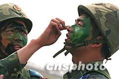 ![]() 解放軍空降兵某偵察兵部隊(duì),四月在野外空降演練時(shí),官兵們根據(jù)地貌互相在臉部涂抹迷彩進(jìn)行偽裝。中新社記者 王麗南 攝
