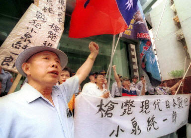 圖文:當局懦弱膽小 臺灣民眾示威抗議小泉參拜 2002年04月24日 10:42 在臺北的日本交流協會門外,示威民眾拉起橫幅抗議日本首相小泉純一郎日前參拜靖國神社。(法新社) 中新網香港4月24日消息:臺北訊,一批臺灣民眾周二上街示威,高呼“打倒日本軍國主義”的口號,抗議日本首相小泉純一郎參拜靖國神社。 綜合外電報道,示威者聚集在日本駐臺北代表辦事處外,揮動拳頭,高舉寫有“處死當代戰犯小泉純一郎”的標語牌。 周日,小泉到靖國神社參拜,靖國神社供奉有包括二戰甲級戰犯東條英機在內的一批戰犯的牌位,是宣揚和支持軍國主義對外侵略戰爭的精神支柱和象征,也是日本一些極右人士企圖為戰爭罪犯張目、為軍國主義借尸還魂的封神壇。 小泉繼去年再次參拜靖國神社,引起中國大陸及韓國政府的憤怒,兩國并提出正式抗議。 但臺灣當局執行親日本的政策,避免批評小泉,在臺灣,抗議示威的規模比韓國的要小。 陳姓示威者說,臺灣政府懦弱,膽小,不敢譴責小泉參拜。他說,“我們不須憎恨日本人,但我們不能忘記歷史。” 示威者中許多人經歷過日本對中國的野蠻侵略,他們認為日本仍不肯面對歷史,承認其戰爭暴行。 相關報道:臺灣報紙發表社論譴責小泉再度參拜靖國神社 相關報道:臺北"理解與寬容"小泉參拜被批患有"歷史軟骨癥" 相關報道:中國駐日大使就小泉參拜靖國神社提出嚴正交涉 相關報道:南京大屠殺幸存者集會抗議小泉參拜靖國神社 相關報道:香港多個團體到日本駐港機構請愿 抗議小泉參拜 相關報道:中國對小泉純一郎參拜靖國神社表示強烈不滿 相關報道:李肇星就日本首相參拜靖國神社向日方嚴正交涉 相關報道:陳水扁首次就小泉參拜靖國神社發表評論 相關報道:李登輝再次鼓吹小泉參拜靖國神社很自然 相關報道:小泉參拜靖國神社 中方表示強烈不滿和憤慨