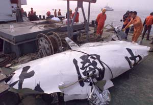 圖文:打撈起重要飛機殘骸 搜尋范圍進一步縮小 2002年05月12日 07:32 ![]() “五-七”空難現(xiàn)場又打撈出一塊較大的飛機殘骸,殘骸上“中國北”三個字清晰可見。(中新社記者王麗南攝) 中新網(wǎng)大連5月12日消息:昨日深夜11時25分,交通部救撈局局長宋家慧給新華社記者打手機說:“今天搜救工作取得重要進展,打撈起飛機頂蓋、起落架、應(yīng)急發(fā)電機、應(yīng)急門、輪胎等重要飛機殘骸,這將對事故原因分析起到重要作用。” 據(jù)新華社報道,宋家慧的聲音在電話里提高了聲調(diào):“更重要的是,根據(jù)已打撈出水的機頭殘骸到機尾殘骸的位置,我們已經(jīng)把飛機墜落的區(qū)域縮小在長600米、寬400米東西方向海域內(nèi),為下一階段的‘黑匣子’打撈和搜救工作開展打開了新的局面。” 據(jù)宋家慧介紹,明天一些救撈船只將暫時調(diào)離現(xiàn)場,等待從國外調(diào)集的“黑匣子”專用控測設(shè)備到達后再次展開新一輪打撈工作。(完)