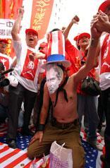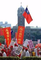 臺(tái)北"反臺(tái)獨(dú)救臺(tái)灣"大游行吁當(dāng)局放棄"臺(tái)獨(dú)"黨綱 2002年05月19日 16:30 ![]() 臺(tái)灣中國(guó)統(tǒng)一聯(lián)盟5月19日發(fā)起“反臺(tái)獨(dú)、救臺(tái)灣”萬(wàn)人大游行。民眾以醒目標(biāo)語(yǔ)及旗幟,表達(dá)支持一個(gè)中國(guó)、反對(duì)“臺(tái)獨(dú)”的立場(chǎng)。(“中央社”圖) ![]() 臺(tái)灣中國(guó)統(tǒng)一聯(lián)盟5月19日發(fā)起“反臺(tái)獨(dú)、救臺(tái)灣”萬(wàn)人大游行,在“美國(guó)在臺(tái)協(xié)會(huì)”門前,由一名面戴面具、扮作美國(guó)總統(tǒng)布什的男子跪地磕頭,就美國(guó)干涉臺(tái)海事務(wù)向臺(tái)灣民眾道歉。(“中央社”圖) 中新社香港五月十九日電 臺(tái)北消息:中國(guó)統(tǒng)一聯(lián)盟今天發(fā)起“五一九反臺(tái)獨(dú)、救臺(tái)灣大游行”,數(shù)千臺(tái)灣民眾身穿“One China”的紅上衣及紅帽子,高呼“反臺(tái)獨(dú)、救臺(tái)灣”,以表達(dá)他們支持一個(gè)中國(guó)、反對(duì)臺(tái)獨(dú)的立場(chǎng)。 據(jù)“中央社”報(bào)導(dǎo),游行隊(duì)伍于下午在臺(tái)北“中正紀(jì)念堂”出發(fā),民眾在經(jīng)過(guò)美國(guó)在臺(tái)協(xié)會(huì)時(shí)高呼“ROT(臺(tái)灣共和國(guó)),爛!爛!爛!One China,贊!贊!贊!”的口號(hào),部分情緒激動(dòng)的民眾并向美國(guó)在臺(tái)協(xié)會(huì)投擲雞蛋。 游行活動(dòng)總領(lǐng)隊(duì)、中國(guó)統(tǒng)一聯(lián)盟主席王津平,日前在獨(dú)派人士的“臺(tái)灣正名”游行活動(dòng)中遭到攻擊而受傷,今天他在游行前發(fā)表演講,抨擊臺(tái)灣當(dāng)局兩年來(lái),在民進(jìn)黨臺(tái)獨(dú)黨綱箝制下,導(dǎo)致兩岸關(guān)系緊張、經(jīng)濟(jì)嚴(yán)重衰退、社會(huì)混亂不安。 王津平說(shuō),今天“反臺(tái)獨(dú)、救臺(tái)灣”大游行的主要訴求,就是呼吁當(dāng)局撤除臺(tái)獨(dú)黨綱,遵守“一個(gè)中國(guó)”,回歸“九二共識(shí)”。 中新網(wǎng)香港5月19日消息:臺(tái)北訊,臺(tái)灣中國(guó)統(tǒng)一聯(lián)盟今天號(hào)召發(fā)起數(shù)十個(gè)島內(nèi)“在野”政黨次級(jí)團(tuán)體、反“臺(tái)獨(dú)”的民眾、車隊(duì)共同參與的“519反‘臺(tái)獨(dú)’、救臺(tái)灣萬(wàn)人大游行”。 此次大游行由中國(guó)統(tǒng)一聯(lián)盟主席王津平擔(dān)任總領(lǐng)隊(duì)。日前為反制“臺(tái)獨(dú)”集團(tuán)的所謂“臺(tái)灣‘正名’游行”而遭暴力攻擊并受傷的王津平,在游行出發(fā)前發(fā)表演說(shuō)指出,陳水扁上臺(tái)兩年以來(lái),都因?yàn)椤芭_(tái)獨(dú)”黨綱箝制當(dāng)局政策發(fā)展,導(dǎo)致兩岸關(guān)系緊張、島內(nèi)嚴(yán)重經(jīng)濟(jì)衰退、社會(huì)混亂。 此次游行的主要訴求,就是呼吁陳水扁當(dāng)局及民進(jìn)黨撤除“臺(tái)獨(dú)”黨綱,遵守“一中原則”,回歸“九二共識(shí)”,以正式渠道恢復(fù)兩岸談判;立即三通,加速經(jīng)濟(jì)互補(bǔ)互利。 此外,游行隊(duì)伍向當(dāng)局喊出“反軍購(gòu)、要福利”、“要顧三通,不要神盾”等口號(hào)。 據(jù)悉,游行隊(duì)伍也以踐踏美國(guó)國(guó)旗的方式,表達(dá)對(duì)美國(guó)介入臺(tái)海事務(wù)的強(qiáng)烈不滿。 另外,中國(guó)統(tǒng)一聯(lián)盟今晚將在舉辦“中國(guó)人團(tuán)結(jié)之夜”音樂會(huì),呼應(yīng)白天的游行主題。 相關(guān)報(bào)道:臺(tái)灣中國(guó)統(tǒng)一聯(lián)盟控告李登輝及"臺(tái)獨(dú)"分子施暴 相關(guān)報(bào)道:董建華會(huì)見臺(tái)灣"中國(guó)統(tǒng)一聯(lián)盟一國(guó)兩制參訪團(tuán)" 相關(guān)報(bào)道:臺(tái)灣中國(guó)統(tǒng)一聯(lián)盟訪港考察"一國(guó)兩制"實(shí)施情況 相關(guān)報(bào)道:臺(tái)灣中國(guó)統(tǒng)一聯(lián)盟抗議海外"臺(tái)獨(dú)"組織在臺(tái)興風(fēng)作浪 相關(guān)報(bào)道:臺(tái)灣“中國(guó)統(tǒng)一聯(lián)盟”抗議日相參拜靖國(guó)神社 相關(guān)報(bào)道:臺(tái)灣中國(guó)統(tǒng)一聯(lián)盟等十多個(gè)團(tuán)體抗議達(dá)賴訪臺(tái) 相關(guān)報(bào)道:臺(tái)灣中國(guó)統(tǒng)一聯(lián)盟座談會(huì)指臺(tái)灣沒理由抗拒“一國(guó)兩制”