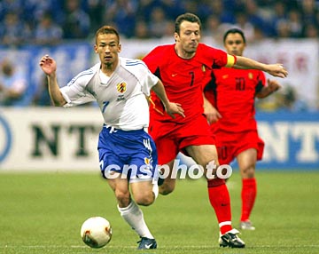 4日,世界杯足球賽上日本隊與比利時隊戰平。圖為日本球星中田英壽帶球突進。作者:cnsphoto