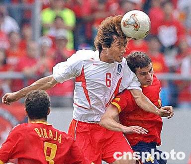 圖:西班牙VS韓國(guó) 柳相鐵飛身頂球 2002年06月22日 15:12 ![]() 6月22日韓日世界杯1/4決賽,西班牙隊(duì)VS韓國(guó)隊(duì)的比賽在韓國(guó)光州體育場(chǎng)進(jìn)行。目前場(chǎng)上比分為0:0。圖為韓國(guó)隊(duì)6號(hào)柳相鐵飛身頂球。