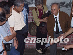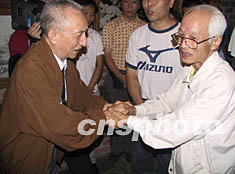 圖為訪中團(tuán)團(tuán)長保村·龍二郎先生向“六五”隧道慘案中的幸存者高鍵文老人深深致敬,二位老人將手緊緊地握在一起。作者:鄒輝