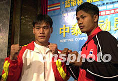 藍帶杯第三屆“中國功夫·泰國職業泰拳爭霸賽”的雙方運動員,五日在廣州與媒體見面。中泰雙方頂尖高手柳海龍(左)與江蓋·諾格(右)等將于九月七日在廣州體育館上演一場精彩的爭霸戰。作者:梁永強