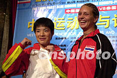 藍帶杯第三屆“中國功夫·泰國職業泰拳爭霸賽”的雙方運動員,五日抵達廣州。爭霸賽中惟一的女對手中國的王戰利與泰國的“外援”來自加拿大的凱麗·克拉德輕松面對傳媒。作者:梁永強