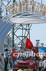 2002年“世紀城杯”中國汽車拉力賽(北京站)6日在海淀區的大學生運動會廣場舉行發車儀式,來自全國的50多輛賽車參加此次比賽。作者:趙振清