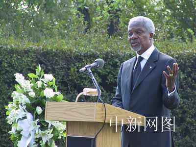 美國東部時間九月十一日上午十時許,聯合國秘書長安南在紐約聯合國總部北草坪舉行的“九一一”周年紀念活動中說,去年的今天悲痛淹沒了整個世界,大約九十個國家的人們在那場悲劇中喪生,他們遇難沒有任何其他理由,只是因為生活在這里。今天,我們不僅要記住那些遇難的人們,而且也要向在危難時刻犧牲自己、拯救別人的人表示敬意。中新社記者 陳建 攝