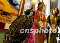 一只卡塔爾蒙面金雕在十月的釜山亞運會新聞中心里,為下屆亞運會在多哈舉行身為吉祥物公關。作者:賈國榮