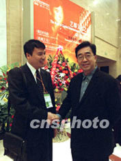 十五日晚,在保利劇院舉行的第五屆北京國際音樂節上《中國情懷》--作曲家葉小綱作品音樂會上,其中《最后的樂園》、《西藏之光》和《長城交響曲》都是第一次正式與觀眾見面。圖為作曲家葉小綱(左)和著名畫家陳逸飛(右)在演出后互致問候。作者:張勤