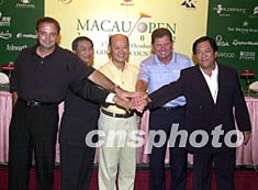 每年一度的大衛(wèi)杜夫巡回賽--澳門高爾夫球公開賽十六日在澳門舉行新聞發(fā)布會,澳門體育發(fā)展局局長肖威利(中)以及曾榮獲三次主要賽事冠軍的普萊斯(右二)等在發(fā)布會上預祝比賽成功。將于十七日在澳門高爾夫球鄉(xiāng)村俱樂部舉行的澳門高爾夫球公開賽已是第五屆舉辦,其獎金高達二十五萬美元。 中新社圖 李剛 攝