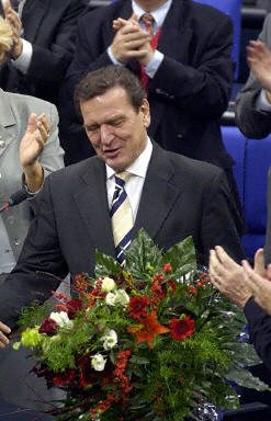 據(jù)國(guó)際在線報(bào)道,施羅德獲得599票中的305票,超過(guò)當(dāng)選所必需的302票,成功蟬聯(lián)德國(guó)總理一職。