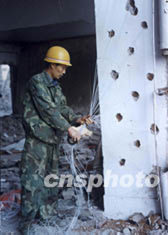 三峽導流明渠截流在即 ,爆破人員在重慶奉節舊縣城,給要拆除的房子裝彈藥,準備進行一次性爆破拆除。作者:李中全