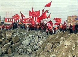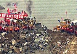 圖:截流成功現場工程人員在圍堰上揮舞紅旗慶賀