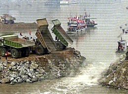 9時48分,自卸卡車向三峽導流明渠龍口傾倒了最后一批石料,滔滔江水被阻住去路。長江水全部改由北岸大壩底部的導流洞流往下游。