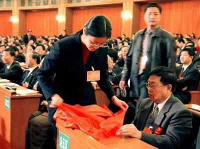 江澤民、李鵬、朱镕基、李瑞環(huán)、胡錦濤、尉健行、李嵐清已相繼在位于主席臺(tái)正中的票箱投票。同時(shí),代表和特邀代表們也開始投票。