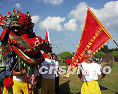 街道路邊椰樹上掛著紅燈籠和慶祝十六大閉幕的紅色標語。下午二時,?谧畲蟮木G化公園早已人山人海,鼓號陣陣,?谌嗣駪阎鵁o比激動的心情,在這片草地上載歌載舞,用舞龍、舞獅、秧歌、扇舞、竹竿舞、腰鼓、軍樂、太極拳等方式,表達他們喜悅的心情。