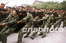 以培養解放軍各級政治干部的南京政治學院,女兵們在初冬的周末進行拔河比賽,眾多男兵為她們吶喊助威。作者:王興會