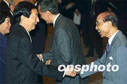 中國國務院總理朱镕基和夫人勞安,11月19日下午在香港會見中資機構的諸位“老板”,香港特首董建華和夫人陪同會見。中新社傳真任晨鳴攝