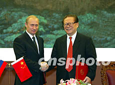 2000年7月,普京總統首次訪華。江主席向普京總統提出,為了確保中俄兩國和兩國人民世代友好、永不為敵,我愿與你共同簽署一個確定雙邊關系長期發展原則與方向的《中俄睦鄰友好合作條約》。普京總統對此積極響應。根據兩國元首的指示,雙方外交部門很快就條約文本達成一致。條約由兩國元首在江主席2001年7月訪俄時順利簽署。