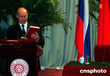 上午十一時(shí),在江澤民主席的陪同下,普京總統(tǒng)走進(jìn)了北京大學(xué)辦公樓會(huì)議廳,就俄羅斯對(duì)外政策和俄中關(guān)系發(fā)表演講。