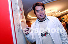 香港影視紅星譚詠麟,12月5日蒞臨香港商報50周年報慶酒會,在題名板簽名。洪少葵 攝