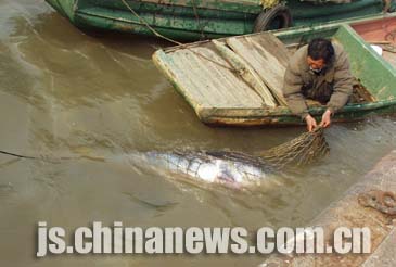 據介紹,白鱘是漁民孫永來昨天下午二時左右在長江下關潛洲以北的江面上捕捉到的。孫永來花費一個多小時將白鱘拖運到一千五百米處的漁政碼頭。