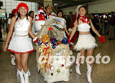 十二月二十日,香港機場購物廊圣誕慶祝活動揭開序幕,圖為身穿美麗服裝的女孩們將圣誕禮品派發給旅客。潘索菲 攝