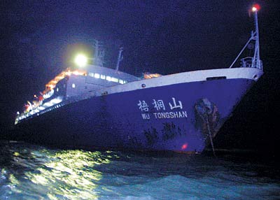 經(jīng)過(guò)近40分鐘的航行后,記者終于看到漆黑海面上燈火通明的“梧桐山”輪。看上去,“梧桐山”輪船體已有些傾斜,但在夜幕中看不到火光和濃煙。