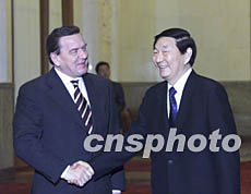 朱镕基首先對施羅德出任總理以來第四次訪華表示歡迎。他說,德國長期以來是中國在歐洲最大的貿易和技術合作伙伴,預計今年兩國貿易將再創新高。德國對華投資也逐年增加,其中很多是大項目。上海磁浮列車的建設成功是中德經貿關系史上值得祝賀的一件大事。兩國還加強了在文化、科技、教育、法律等領域的交流與合作,雙邊關系的內涵不斷充實。