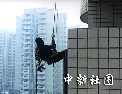 26日,成都首次反恐怖演習(xí)。在處置恐怖分子對(duì)某跨國(guó)公司辦公大樓實(shí)施的劫持人質(zhì)的演習(xí)中,特警秘密潛入大樓,準(zhǔn)備伺機(jī)行動(dòng)。作者:劉真