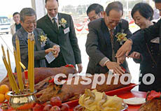 九廣鐵路公司落馬洲支線動土儀式一月九日在香港落馬洲舉行,該支線全長7.4公里,由上水站向西北伸延經古洞、洲頭至落馬洲車站 。圖為眾官員在儀式上拜神。錢興強 攝