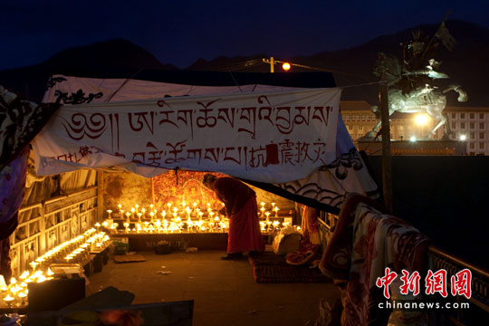 青海格薩爾王廣場點起酥油燈為逝者祈禱