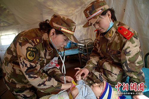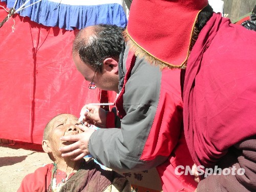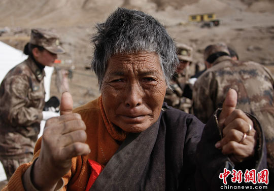 藏族老阿媽向抗震醫療隊員豎大拇指