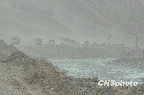 圖:軍民車隊穿越風沙馳援玉樹災區
