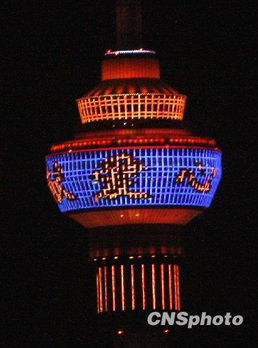 北京中央電視塔點亮愛心 哀悼玉樹地震遇難者