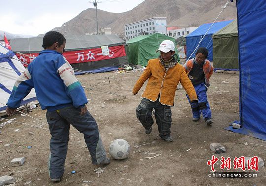 青海玉樹地震:領取救災物品的受災民眾行走在塵土中
