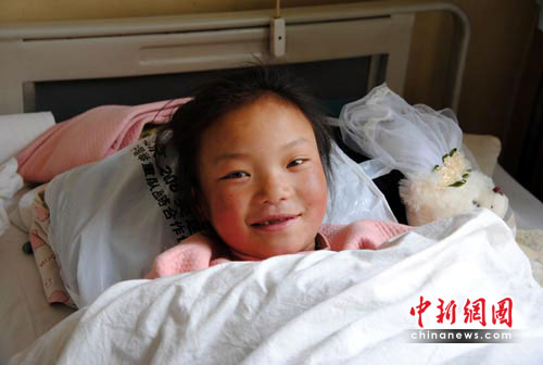 圖:玉樹7歲小傷員甘頓瓊珠蘭州治療笑容燦爛
