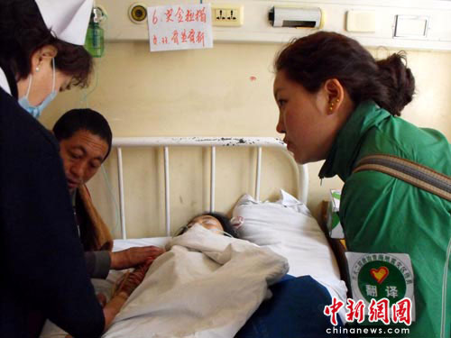 圖:震區(qū)傷員轉(zhuǎn)至蘭州治療 藏族大學(xué)生志愿做翻譯