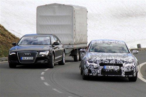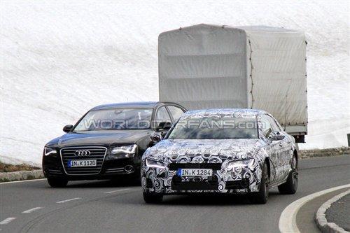 近日奧迪A7和新一代A8同時出現在奧地利的高速公路上,雖說A7的測試已經進入尾聲并且即將發布,但是嚴謹的德國人依舊將這臺全新四門Coupe包裹的嚴嚴實實的,不過就算是這樣,路試車輛還是留下了一些蛛絲馬跡。
