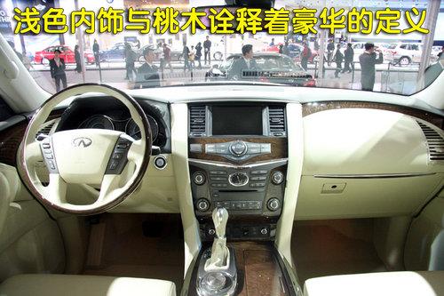在來到英菲尼迪QX56內室前,我就已經想到了它會非常豪華,而眼前所看到的與先前的想法很一致。如果將內室的圖片先行解析,我們很難想到這是一款SUV車型,而它更像是一款豪華轎車。內飾全部由米色的真皮與桃木充斥著,溫暖與豪華也是QX56所想要的。白色的刻度、指針與藍色的裝飾背光組合的儀表盤,給略帶中庸的內飾增添了一分時尚感。
