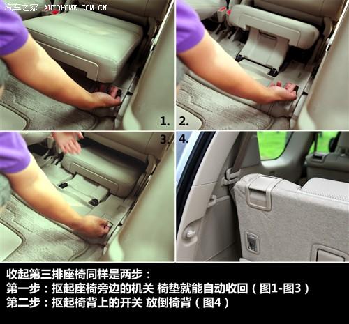 在打開第三排座椅的情況下,普拉多后備廂的儲物空間已經近乎于零了,所以滿載7人之后,應該趕快把第三排座椅收回去,不會?請看上圖。收起第三排座椅同樣是兩步,先摳起座椅旁邊的機關,椅墊就可以自動收回了,然后再摳起椅背上的開關,放倒椅背就可以恢復如初了。